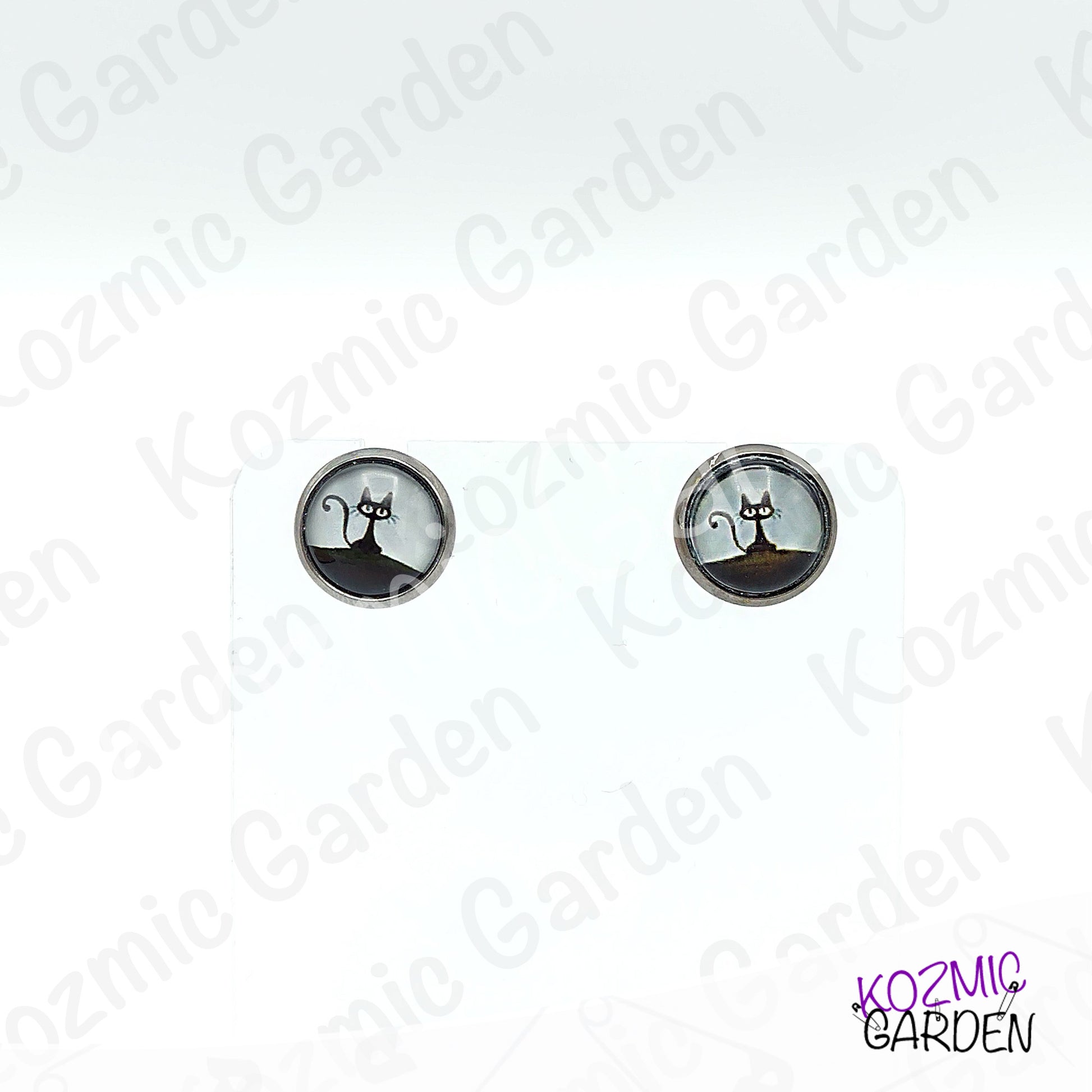 Purr-fectly adorable! These cabochon stud earrings showcase a charming cartoonish black cat sitting with the sweetest big-eyed, whimsical expression – pure kawaii cuteness in a glossy dome!