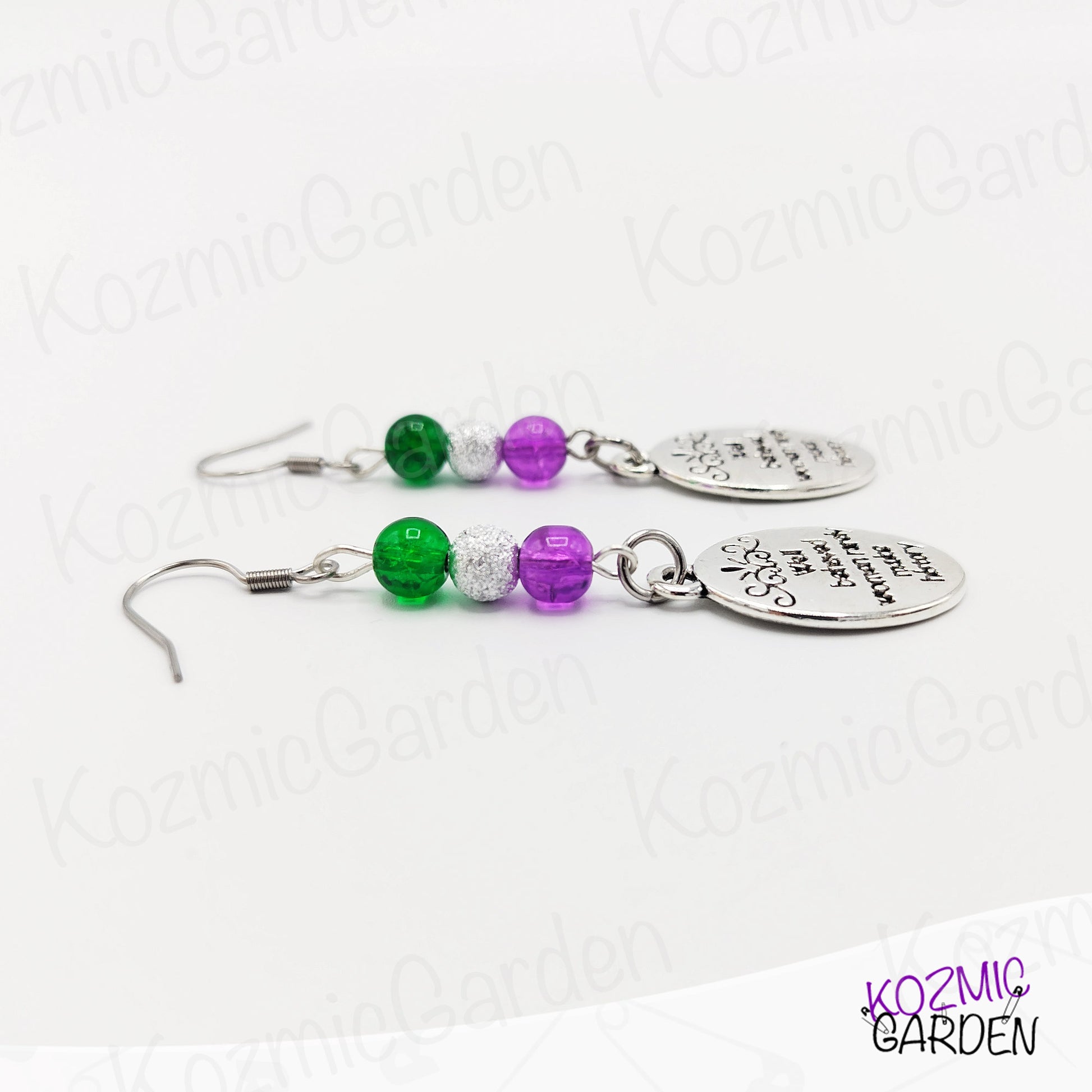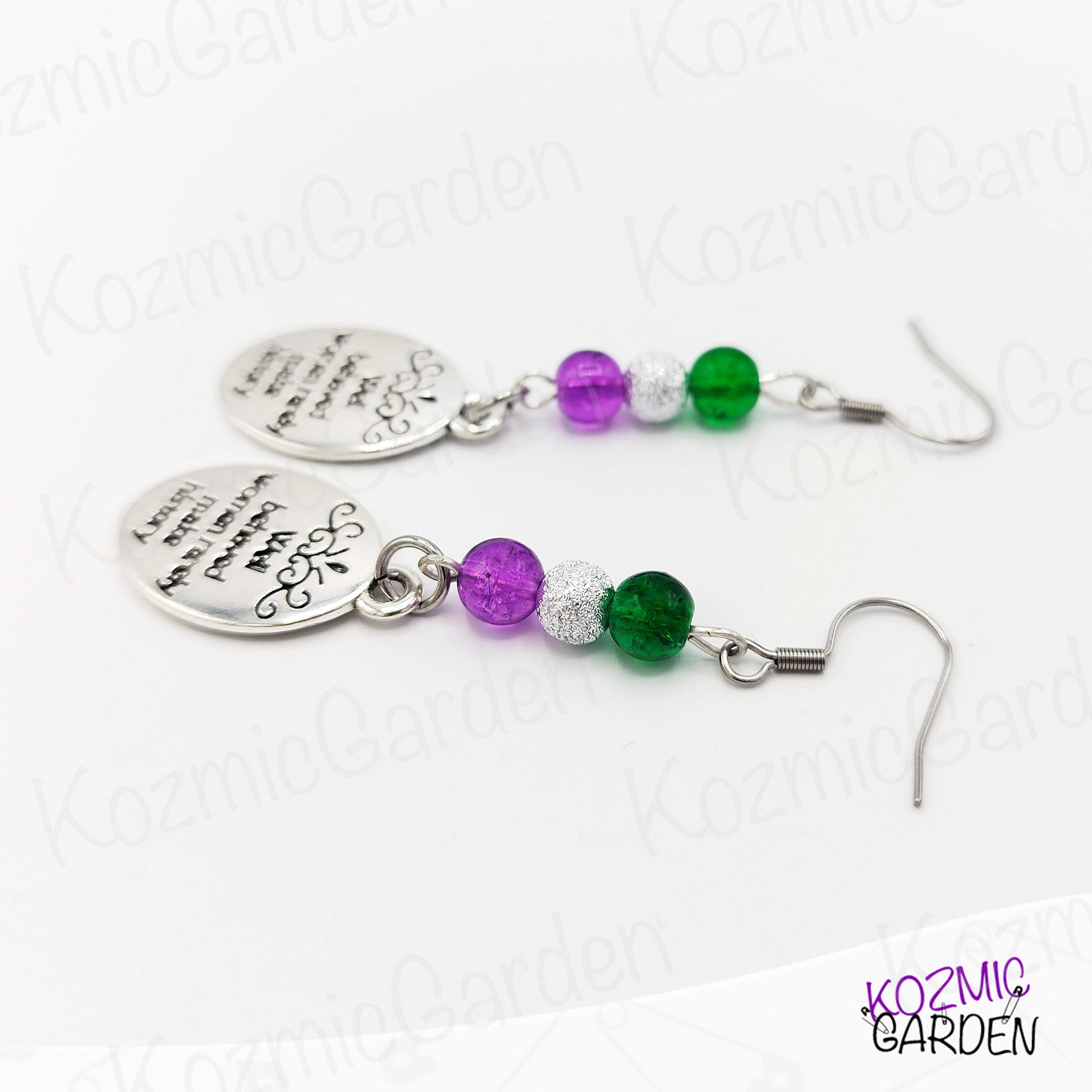 Celebrate the spirit of the Suffragettes with these empowering earrings featuring an oval plaque engraved with the iconic phrase: 'Well Behaved Women Rarely Make History.' Each plaque is adorned with three beads in purple, green, and silver—the symbolic colors of the Suffragette movement, representing dignity, hope, and purity.